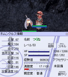 ホム、というのはちょっと獲得経験値の仕組みが難しく、ホムと一緒に殴った場合、ケミには共闘が入るのですが、ホムの経験値は減ってしまいます。つまり、ホムにとっては「自分で殴った分のみ経験値が入る」訳です。