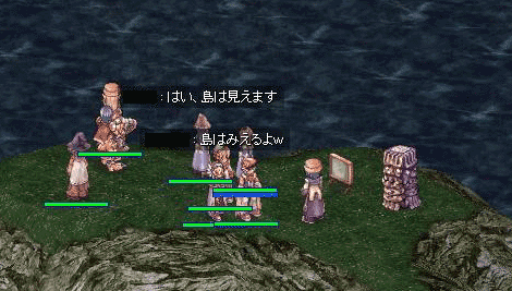 毎回のお約束、ET入り口のミスティーアイランドでのほのぼのとした会話。WIZさん所属Gの人は、みんなイルカが見えたそうです。心の綺麗な人が多いんですネ。ウチのGではすっかり汚れた大人になり童心は消え去りました。そうそう、この島に新しいNPCがいます。探してみてね!