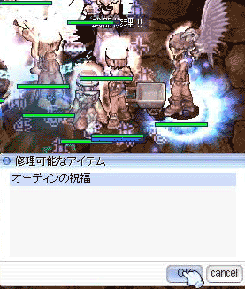 何気に修理する方もされる方も初めて。Gvでもやってない限り、武器修理なんて使わないからねー。鋼鉄とオリ原10個ずつ持って・・・・意外と修理しました。鎧3回、武器1回、頭装備3回。持ち込んだ物資は、カボパイ200、青石200、ランカWSP50、アサイ50。