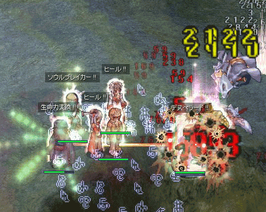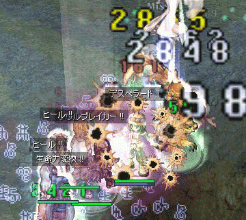 狩り方はほぼ砂さん火力の固定PTと同じです。ただSP消費が砂比2倍なので、教授さんの忙しさは半端なし。あと、デスペラは近接攻撃なので釣の隣に隣接せねばならず、HPさんは速攻SWを出さねばならず・・・・あと、結構死ぬ時は瞬殺なので基本ゾンビアタックになります誰ですかデス☆ペナードとか言ったヒトは!!!(ベールをしている♂HPさんデス)