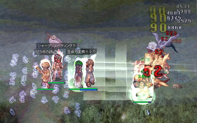 最小構成メンバーですナ。(PT狩りとして)ちょっぴり銃を出したかった 途中半壊しかけてごめんなさい。SW出すのがどうも遅い・・・あと青石持ってくるのが少なすぎた。200個持ってきたらよかった。レベル帯が81(私)から91で、レベルが上がりそうになると91さんが「リザキルタイム」としてガンガン死んでくれました。申し訳なかった・・・というかその死にっぷりは正に漢ダッタ。カッコヨカッタ!