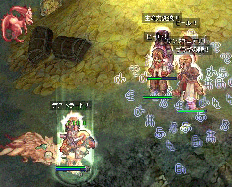 大型特化に闇水付与でドラヘル。あと今思い出したけどコインするの忘れてる。釣さんが運ぶ竜をデスペラで倒すのですが、これがもーSPがナンボあっても足りない・・・・・デスペラは中心からずれるとHitが減るので、なるべく中心でやりたいのですが、タゲが映ると瞬殺されてしまうのでどうしても少し開けてデスペラしないと・・・・この辺りが難しかったなぁ。竜8~10でSP補給されて2回分カラ(総SP601)になりました。もうちょっと慣れないとダメだ。あと教授・鳥いないPTには絶対参加しないで置こうと思った。無理無理ちょームリ。