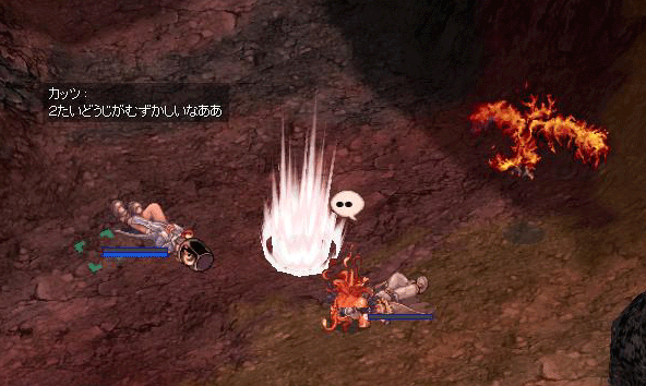 色々試した結果、昨日の狩りでは14%から7%への落ちっぷり。正確には14→10→11→10→7%という結果でした。何という乱高下。どのMobでも、1体ずつだったら何とかなるんですが、2体来るとそりゃもう大騒ぎデス。後、やっぱり慣れてないってのが原因かなぁ。実はペア狩りは昨日が始めてだったんですよね。なもんで二人で「あーでもないこーでもない・こう動こうあぁしよう」と相談しながらの狩りでした。こういうのは面白いよね。