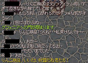 重点的にりんご商店でした。ケミからはいまーちゃんへ。そしてクリエになるんじゃー・・・・と我ながら必死の沈没船。GMから借りたギロチンその他を担いで、アイスもってハエもって、カートに初心者赤P詰め込んで、毎日毎日、CRCRCRCRCR・・・・