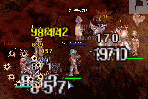 教授さんを盾に。後ろで私がデスペラマシーン。ブラギがあるのでクルクルクルクル。弓鷹の二人が固い竜を落としてくれます。そうそう、フルバも6になったので、今日はちょっとGKDDを持ってきました。赤デビルチに約3kダメ。多いの?少ないの??