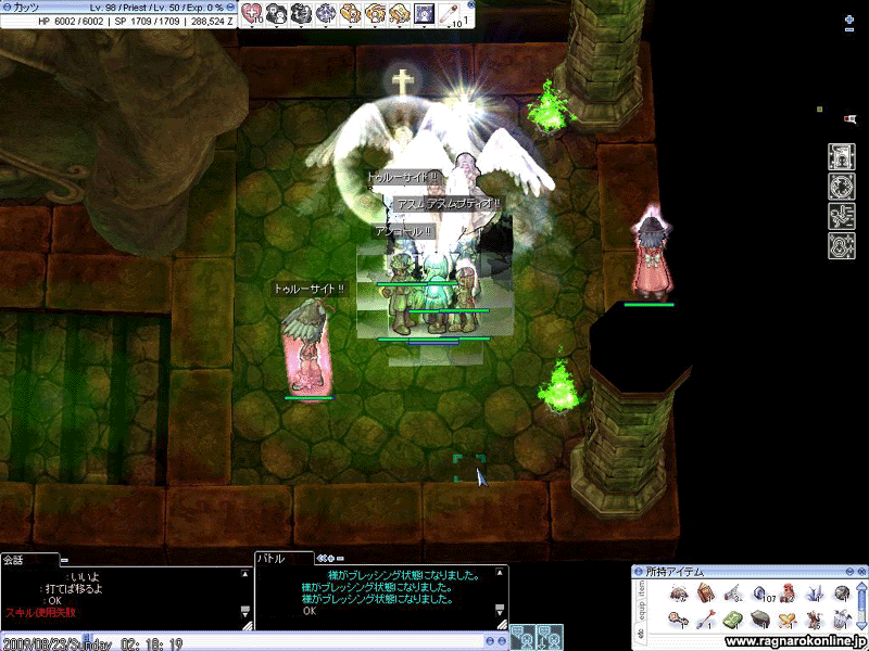 これで5回目のETですが、ここまでは順調(え?)に登ってこれるようになりました。大体集まるのは7~10人。前衛LK1、攻撃砂2、鳥、HP2、プリ(私)に時々教授とダンサー。このメンバーだとやっぱりここが関門&時間ギリギリでは?というコト。確かに、その上は登れる気がしない・・・・・一番の問題はWIZとBSがいない事らしいです。毎回鎧やら武器やら壊されてる。