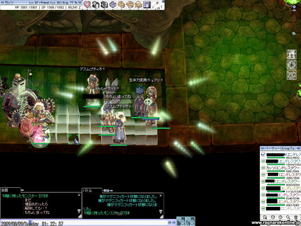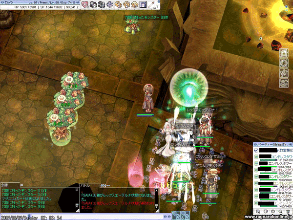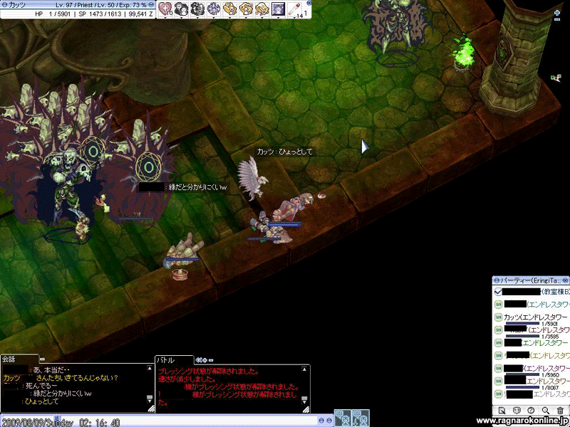 それでも若干の話し合いの末、取り巻きはLKさんが抱え、ボスはHPその1さんが持つコトに。HPその2さんが二人のアスムリカバを持ち、私がサンクロードを引きまくり(階段全部サンクww)、鳥さんが砂さんの隣でブラギ、そして鷹が飛びまくり! 何とか倒すことに成功しました!