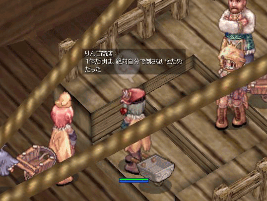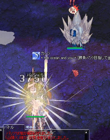 「それ倒さないで下さい~~!!!」とタイプするのが精一杯でした。あわてて先にタゲをとっていたオボンヌ1体をやっつけたものの、レログロ2体は他所様のホムに倒され、ガクガクブルブルです・・・・祈るような気持ちでクリックすると、クエが進み、くじら島へ入ることが出来ました。ホッ^^;