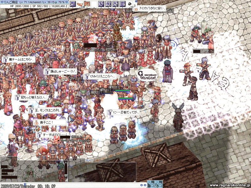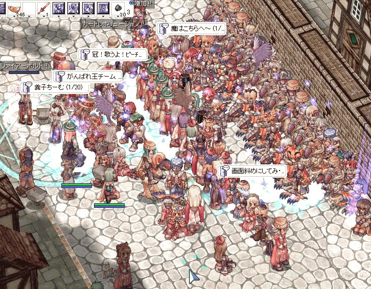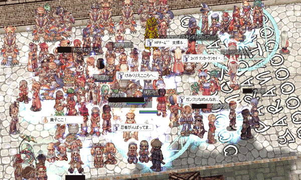 様々な職のスキル連打でどんどん重くなっていきます。そして、何故か増える観客席では、同職を呼び込むチャットが立ち始めました。